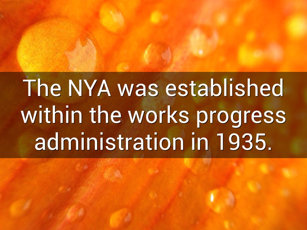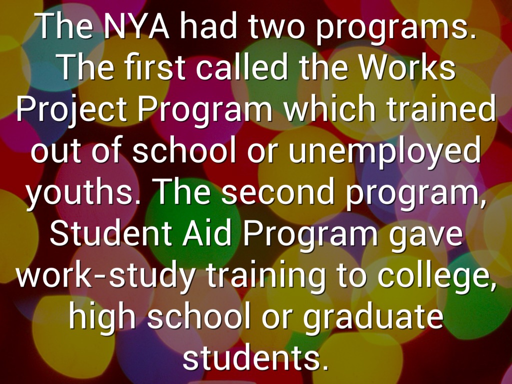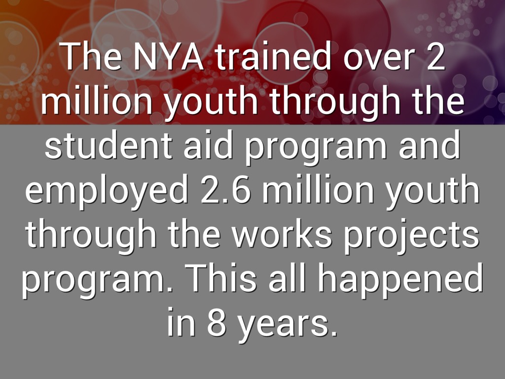 The NYA trained over 2 million youth through the student aid program and employed 2.6 million youth through the works projects program. This all happened in 8 years.