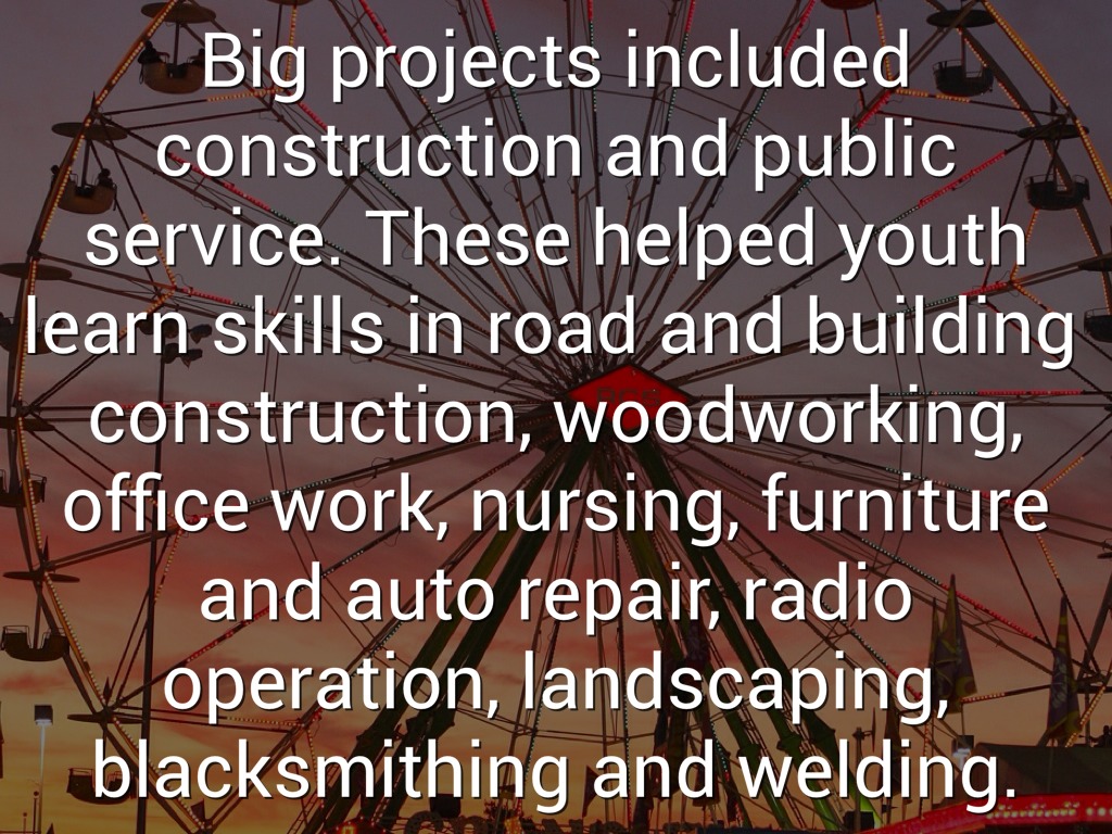 Big projects included construction and public service. These helped youth learn skills in road and building construction, woodworking, office work, nursing, furniture and auto repair, radio operation, landscaping, blacksmithing and welding.