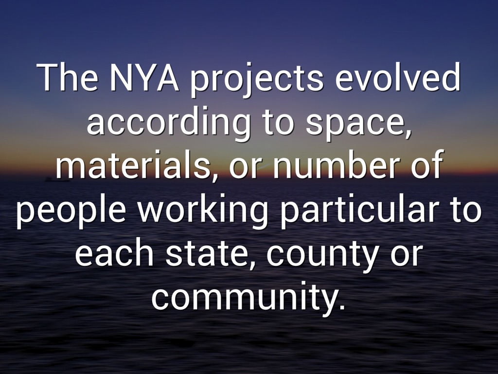 The NYA projects evolved according to space, materials, or number of people working particular to each state, county or community.