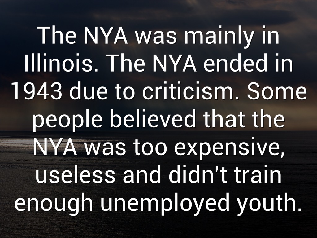 The NYA was mainly in Illinois. The NYA ended in 1943 due to criticism. Some people believed that the NYA was too expensive, useless and didn't train enough unemployed youth.