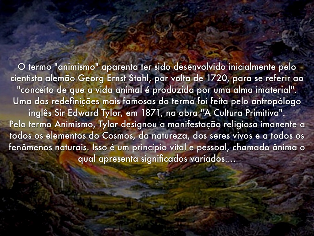 Pelo termo Animismo, Tylor designou a manifestação religiosa imanente a todos os elementos do Cosmos, da natureza, dos seres vivos e a todos os fenômenos naturais. Isso é um princípio vital e pessoal, chamado ânima o qual apresenta significados variados.