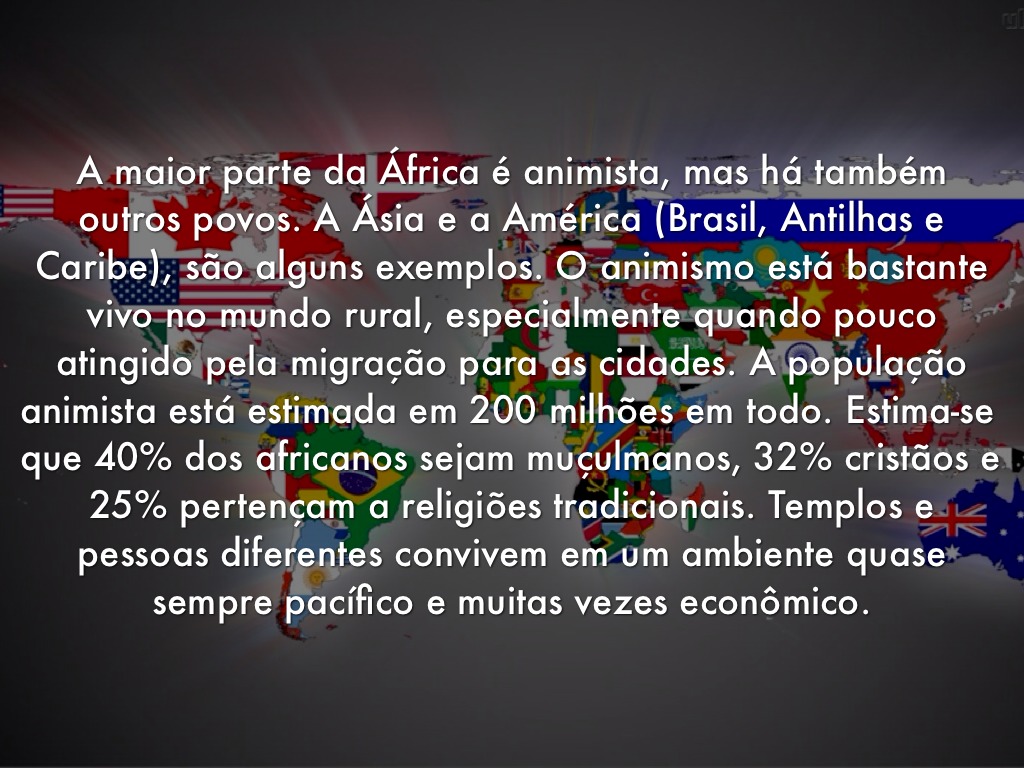 A maior parte da África é animista, mas há também outros povos. A Ásia e a América (Brasil, Antilhas e Caribe), são alguns exemplos. O animismo está bastante vivo no mundo rural, especialmente quando pouco atingido pela migração para as cidades. A população animista está estimada em 200 milhões em todo. Estima-se que 40% dos africanos sejam muçulmanos, 32% cristãos e 25% pertençam a religiões tradicionais. Templos e pessoas diferentes convivem em um ambiente quase sempre pacífico e muitas vezes econômico.