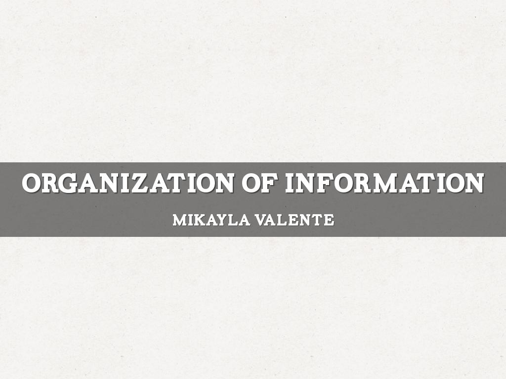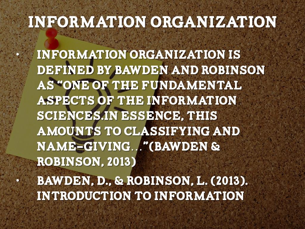 Information organization is defined by Bawden and Robinson as “one of the fundamental aspects of the information sciences.In essence, this amounts to classifying and name-giving…”(Bawden & Robinson, 2013)