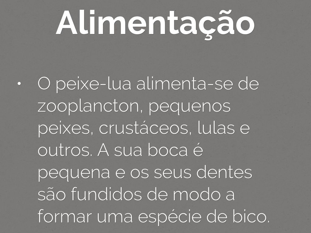 O peixe-lua alimenta-se de zooplancton, pequenos peixes, crustáceos, lulas e outros. A sua boca é pequena e os seus dentes são fundidos de modo a formar uma espécie de bico.