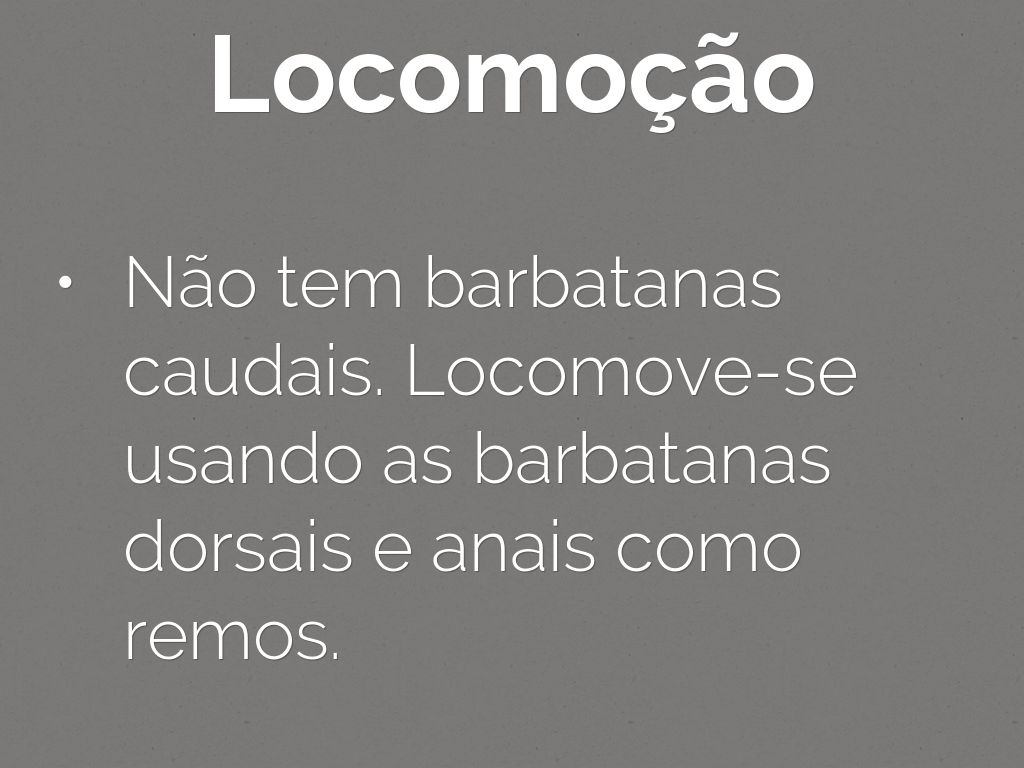 Não tem barbatanas caudais. Locomove-se usando as barbatanas dorsais e anais como remos.