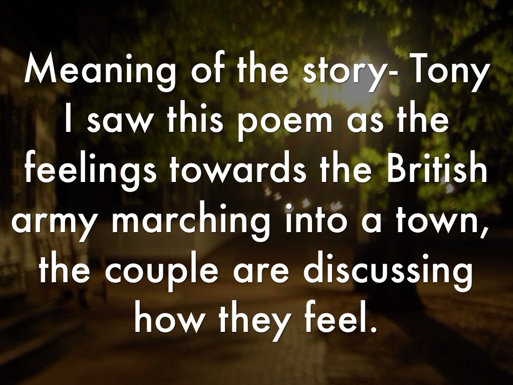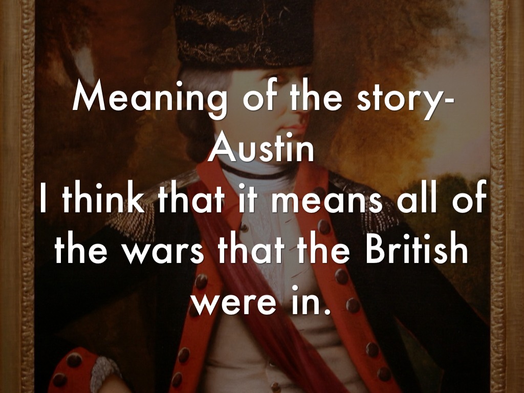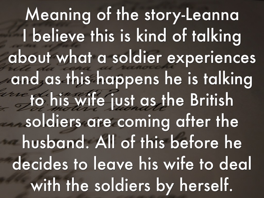 Meaning of the story-Leanna I believe this is kind of talking about what a soldier experiences and as this happens he is talking to his wife just as the British soldiers are coming after the husband. All of this before he decides to leave his wife to deal with the soldiers by herself.