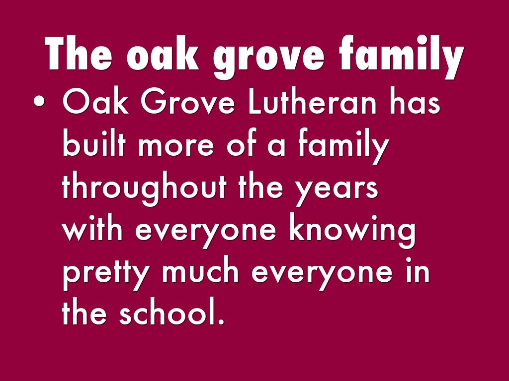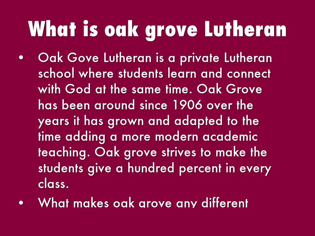 Oak Gove Lutheran is a private Lutheran school where students learn and connect with God at the same time. Oak Grove has been around since 1906 over the years it has grown and adapted to the time adding a more modern academic teaching. Oak grove strives to make the students give a hundred percent in every class.