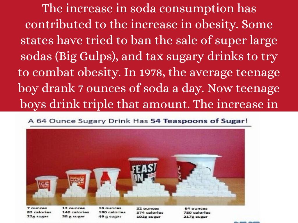 The increase in soda consumption has contributed to the increase in obesity. Some states have tried to ban the sale of super large sodas (Big Gulps), and tax sugary drinks to try to combat obesity. In 1978, the average teenage boy drank 7 ounces of soda a day. Now teenage boys drink triple that amount. The increase in soda consumption also depletes the body of both calcium and magnesium leading to osteoporosis.