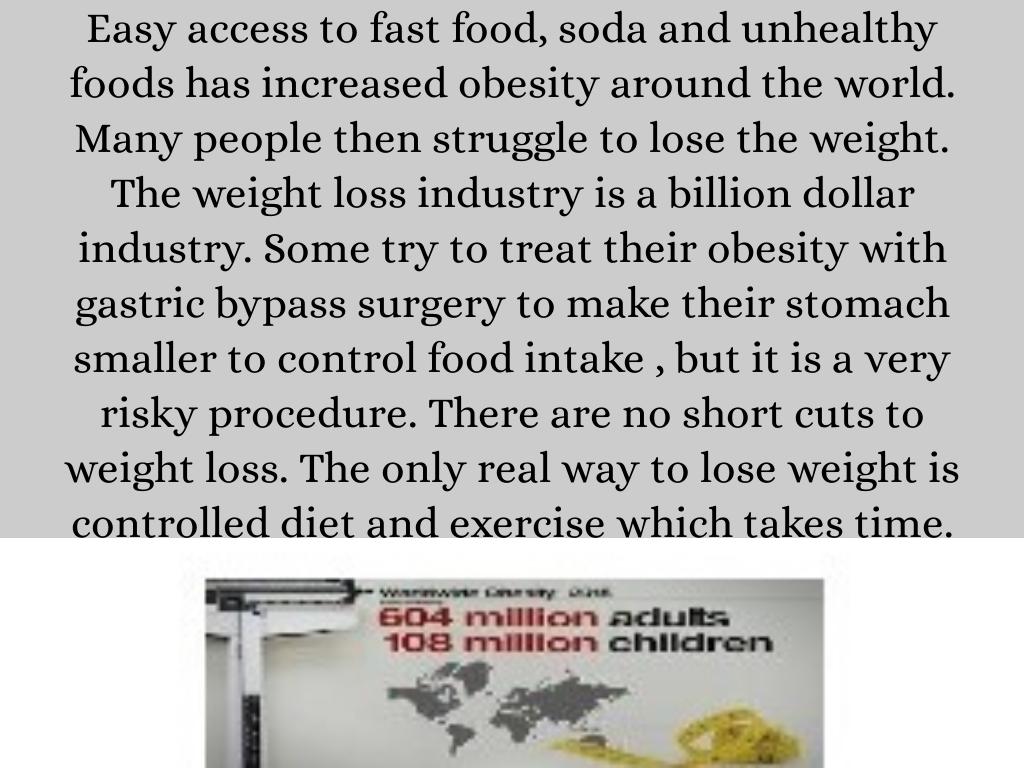 Easy access to fast food, soda and unhealthy foods has increased obesity around the world. Many people then struggle to lose the weight. The weight loss industry is a billion dollar industry. Some try to treat their obesity with gastric bypass surgery to make their stomach smaller to control food intake , but it is a very risky procedure. There are no short cuts to weight loss. The only real way to lose weight is controlled diet and exercise which takes time.