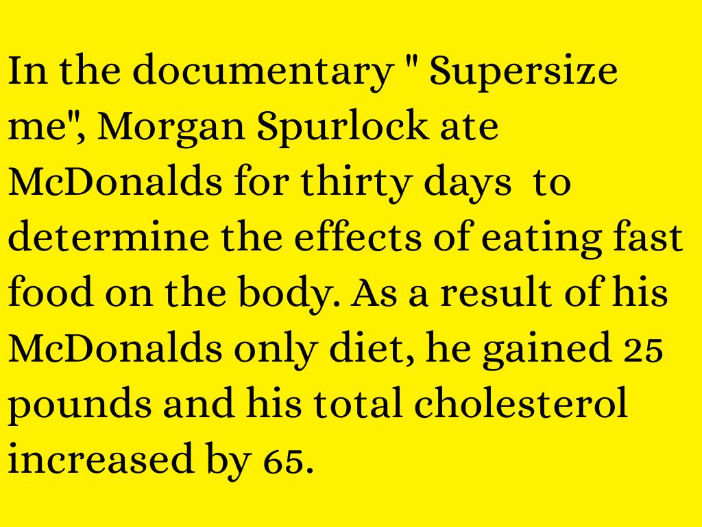 In the documentary " Supersize me", Morgan Spurlock ate McDonalds for thirty days to determine the effects of eating fast food on the body. As a result of his McDonalds only diet, he gained 25 pounds and his total cholesterol increased by 65.