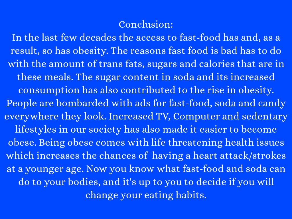 In the last few decades the access to fast-food has and, as a result, so has obesity. The reasons fast food is bad has to do with the amount of trans fats, sugars and calories that are in these meals. The sugar content in soda and its increased consumption has also contributed to the rise in obesity. People are bombarded with ads for fast-food, soda and candy everywhere they look. Increased TV, Computer and sedentary lifestyles in our society has also made it easier to become obese. Being obese comes with life threatening health issues which increases the chances of having a heart attack/strokes at a younger age. Now you know what fast-food and soda can do to your bodies, and it's up to you to decide if you will change your eating habits.