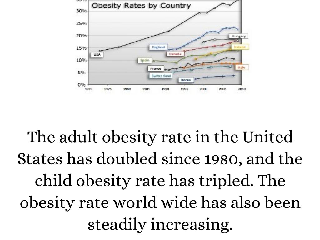 The adult obesity rate in the United States has doubled since 1980, and the child obesity rate has tripled. The obesity rate world wide has also been steadily increasing.