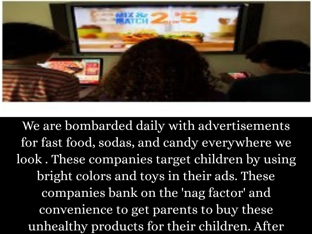 We are bombarded daily with advertisements for fast food, sodas, and candy everywhere we look . These companies target children by using bright colors and toys in their ads. These companies bank on the 'nag factor' and convenience to get parents to buy these unhealthy products for their children. After seeing all these ads and having your parents take you become loyal costumers who buy till they die.