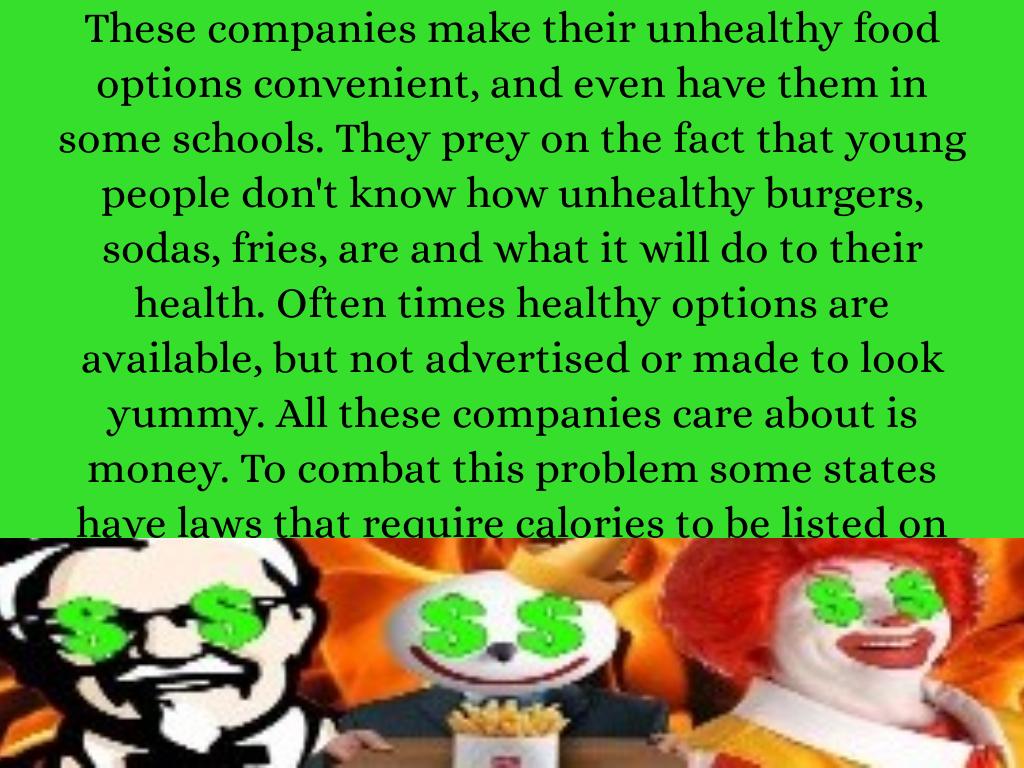 These companies make their unhealthy food options convenient, and even have them in some schools. They prey on the fact that young people don't know how unhealthy burgers, sodas, fries, are and what it will do to their health. Often times healthy options are available, but not advertised or made to look yummy. All these companies care about is money. To combat this problem some states have laws that require calories to be listed on menus.