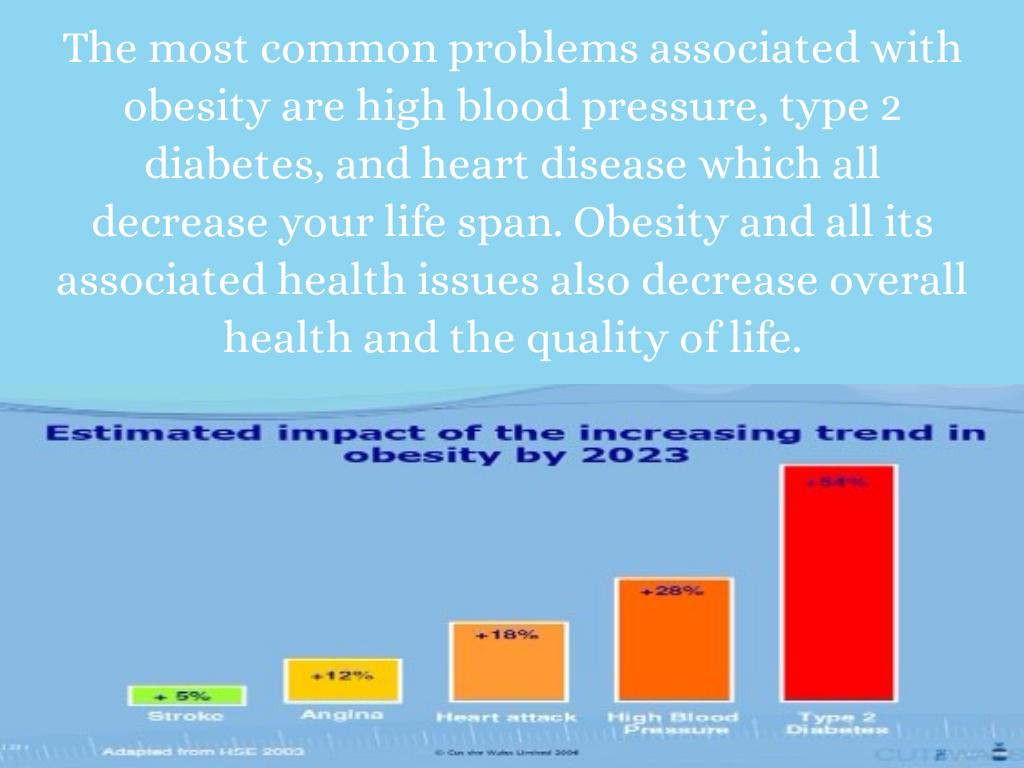 The most common problems associated with obesity are high blood pressure, type 2 diabetes, and heart disease which all decrease your life span. Obesity and all its associated health issues also decrease overall health and the quality of life.