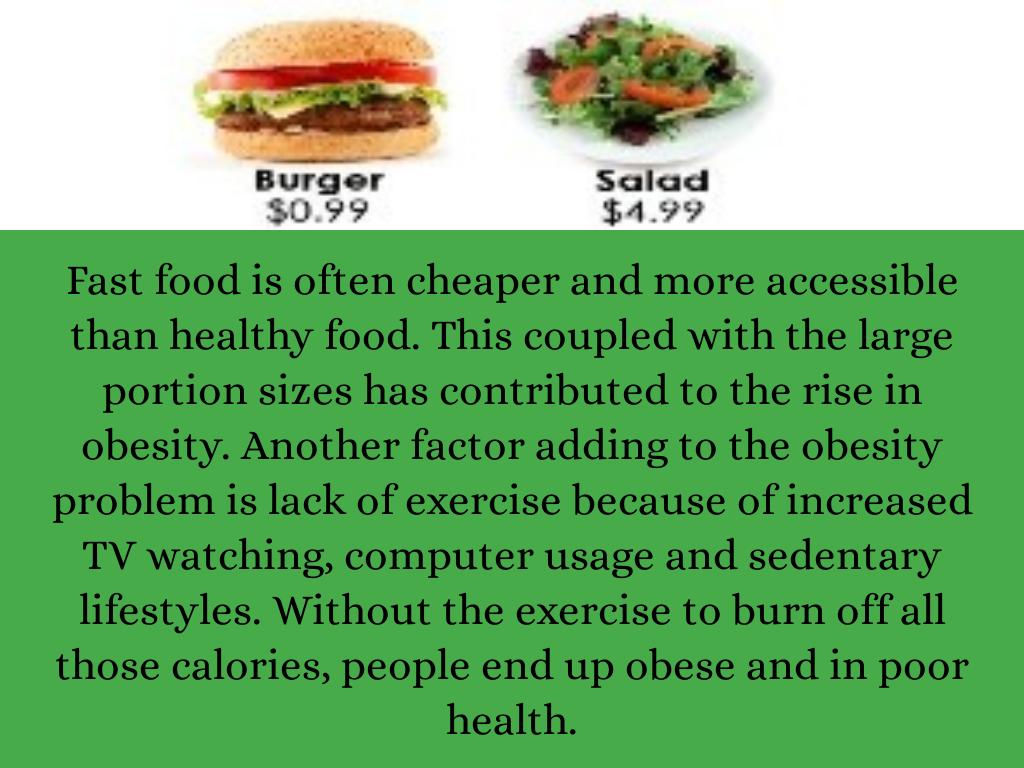 Fast food is often cheaper and more accessible than healthy food. This coupled with the large portion sizes has contributed to the rise in obesity. Another factor adding to the obesity problem is lack of exercise because of increased TV watching, computer usage and sedentary lifestyles. Without the exercise to burn off all those calories, people end up obese and in poor health.