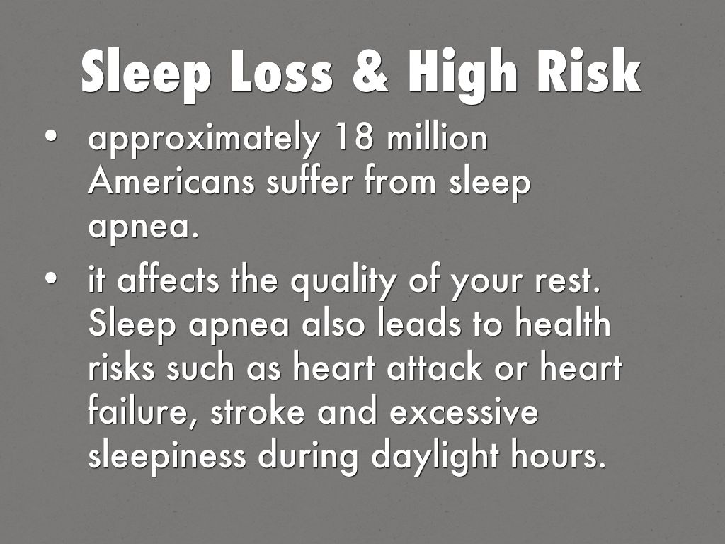 it affects the quality of your rest. Sleep apnea also leads to health risks such as heart attack or heart failure, stroke and excessive sleepiness during daylight hours.