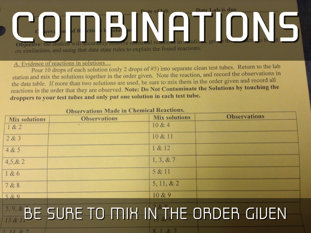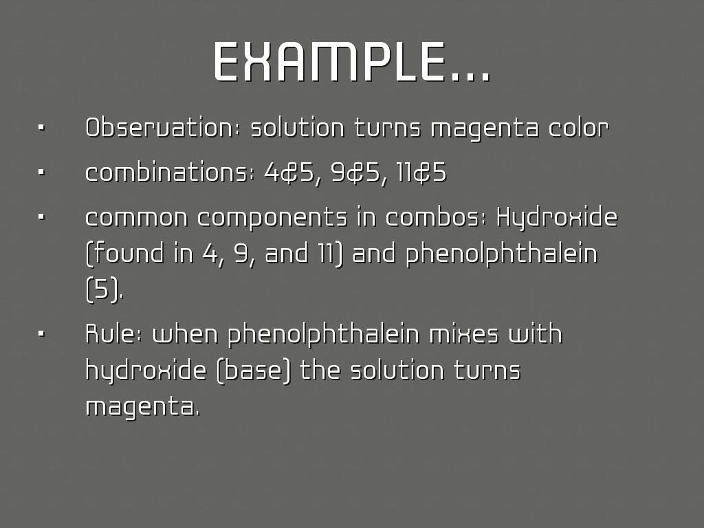 common components in combos: Hydroxide (found in 4, 9, and 11) and phenolphthalein (5).
