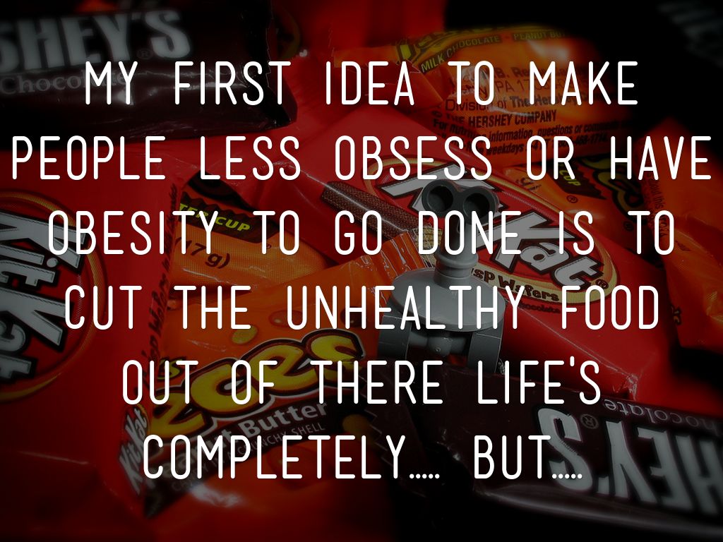 My first idea to make people less obsess or have obesity to go done is to cut the unhealthy food out of there life's completely..... But.....