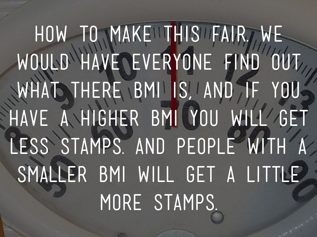 How to make this fair. We would have everyone find out what there BMI is, and if you have a higher BMI you will get less stamps. And people with a Smaller BMI will get a little more stamps.