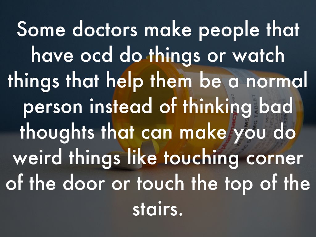 Some doctors make people that have ocd do things or watch things that help them be a normal person instead of thinking bad thoughts that can make you do weird things like touching corner of the door or touch the top of the stairs.