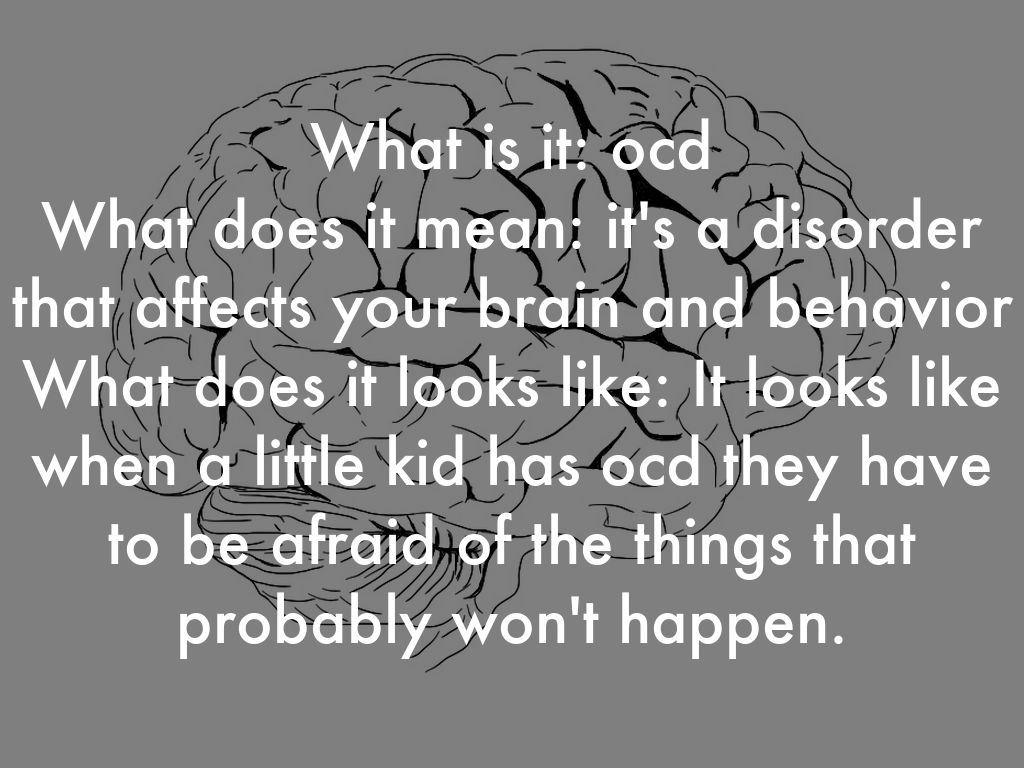 What is it: ocd What does it mean: it's a disorder that affects your brain and behavior What does it looks like: It looks like when a little kid has ocd they have to be afraid of the things that probably won't happen.
