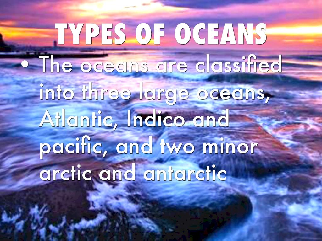 The oceans are classified into three large oceans, Atlantic, Indico and pacific, and two minor arctic and antarctic