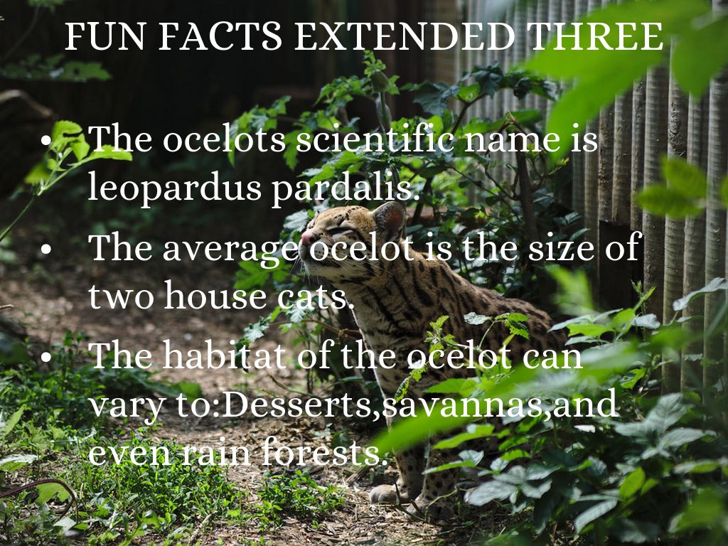 The habitat of the ocelot can vary to:Desserts,savannas,and even rain forests.