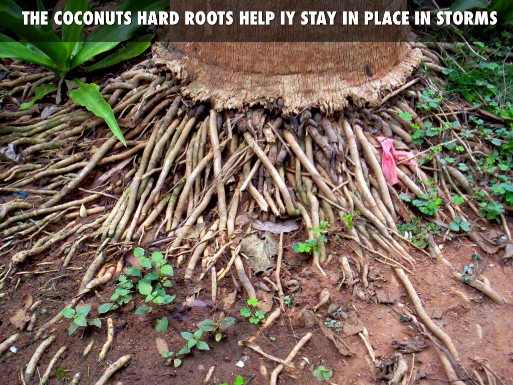 THE COCONUTS HARD ROOTS HELP IY STAY IN PLACE IN STORMS