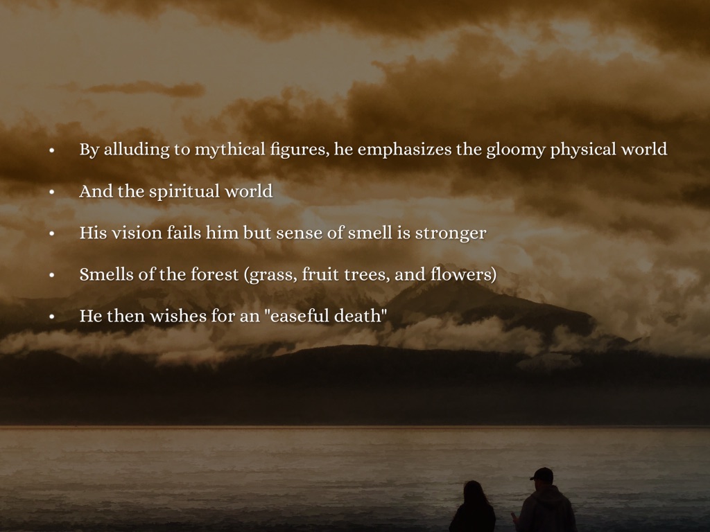 By alluding to mythical figures, he emphasizes the gloomy physical world