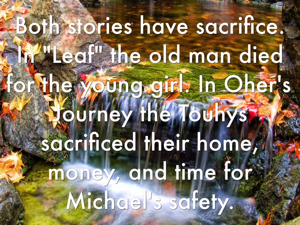 Both stories have sacrifice. In "Leaf" the old man died for the young girl. In Oher's Journey the Touhys sacrificed their home, money, and time for Michael's safety.