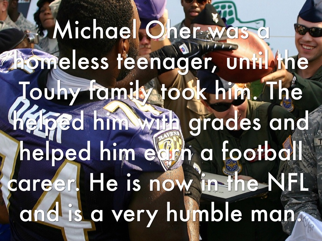 Michael Oher was a homeless teenager, until the Touhy family took him. The helped him with grades and helped him earn a football career. He is now in the NFL and is a very humble man.