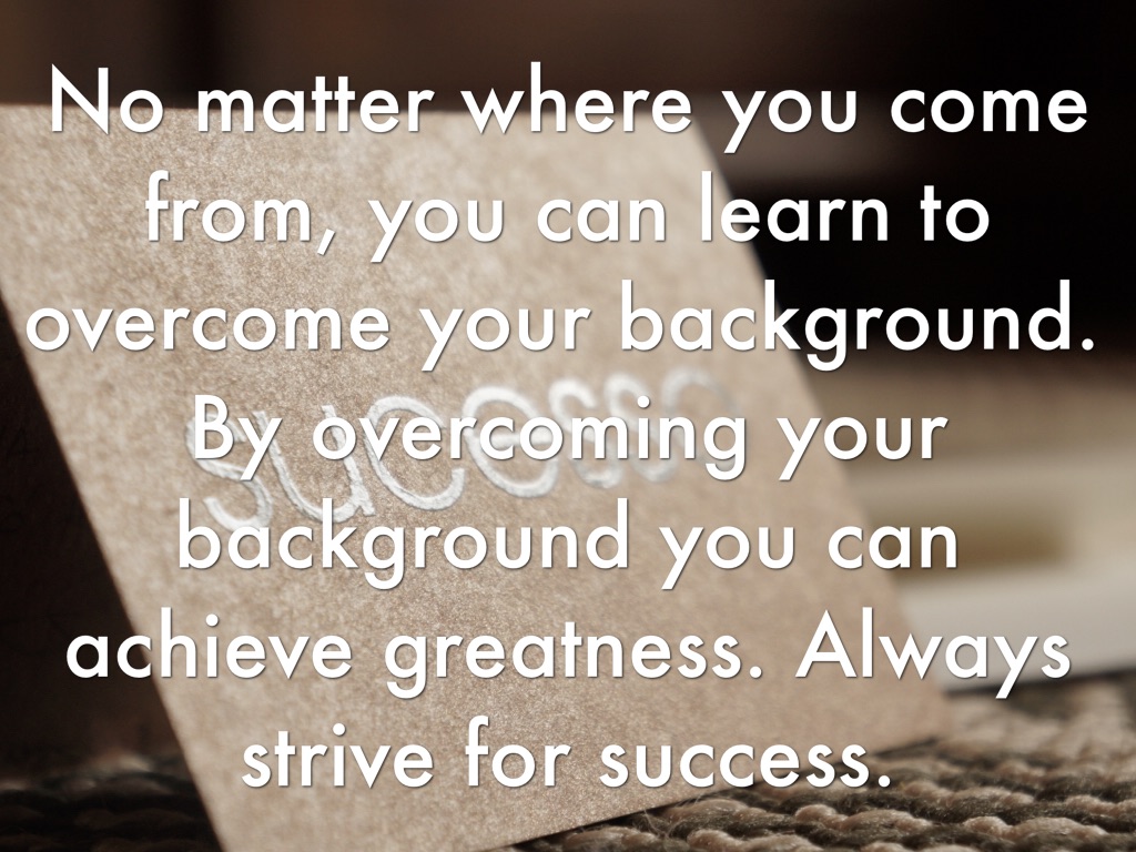 No matter where you come from, you can learn to overcome your background. By overcoming your background you can achieve greatness. Always strive for success.