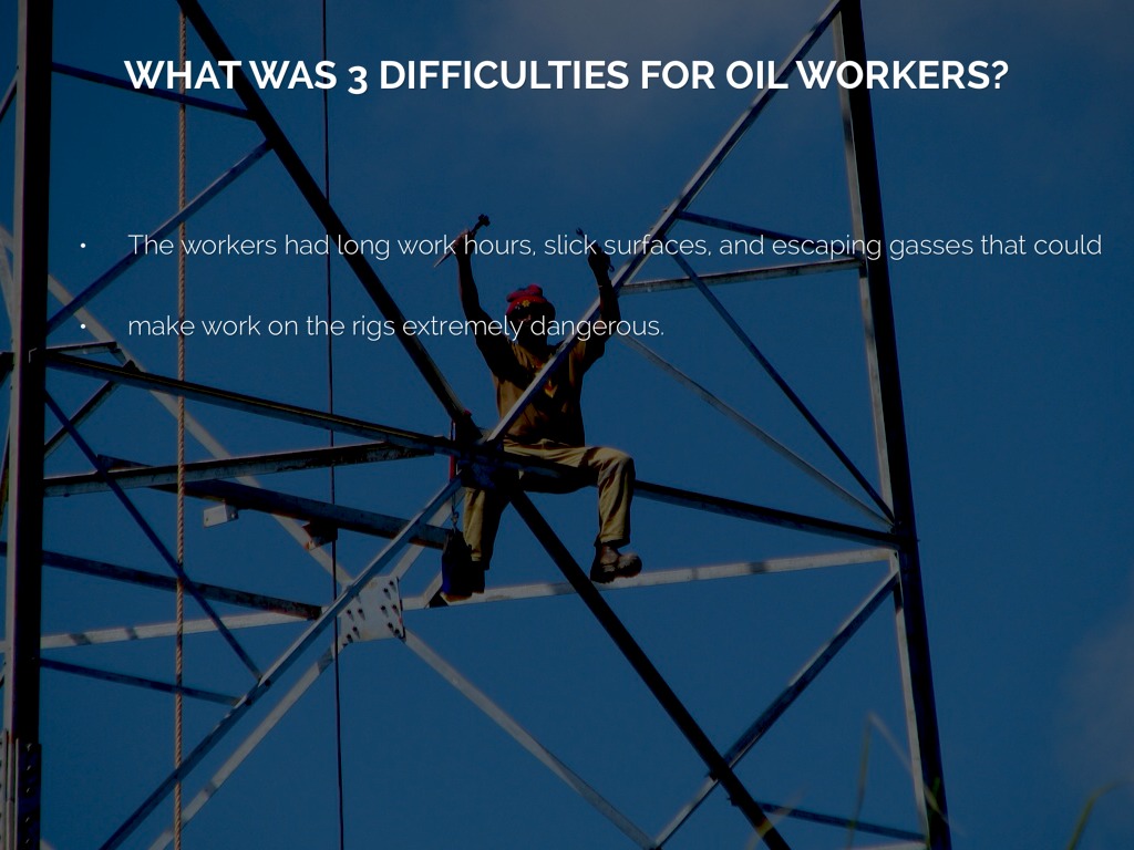 WHAT WAS 3 DIFFICULTIES FOR OIL WORKERS?