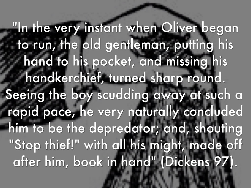 "In the very instant when Oliver began to run, the old gentleman, putting his hand to his pocket, and missing his handkerchief, turned sharp round. Seeing the boy scudding away at such a rapid pace, he very naturally concluded him to be the depredator; and, shouting "Stop thief!" with all his might, made off after him, book in hand" (Dickens 97).