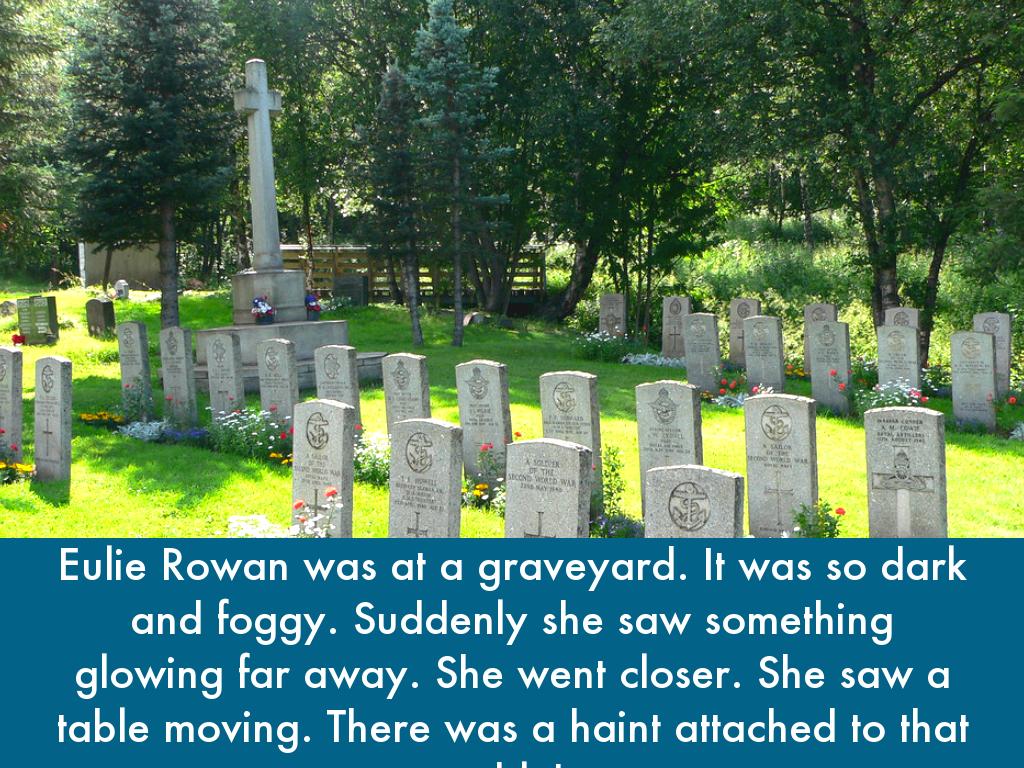 Eulie Rowan was at a graveyard. It was so dark and foggy. Suddenly she saw something glowing far away. She went closer. She saw a table moving. There was a haint attached to that table!