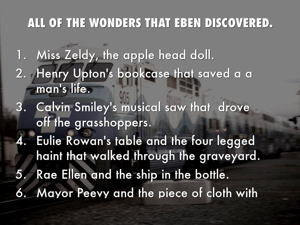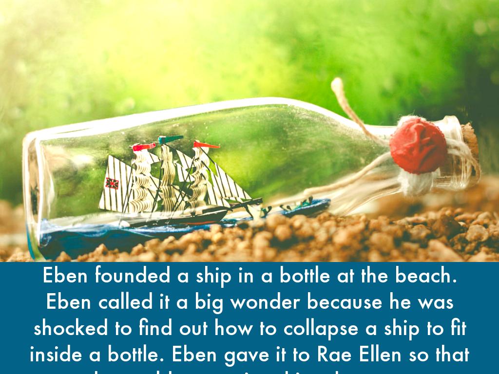 Eben founded a ship in a bottle at the beach. Eben called it a big wonder because he was shocked to find out how to collapse a ship to fit inside a bottle. Eben gave it to Rae Ellen so that she could appreciate his adventure.