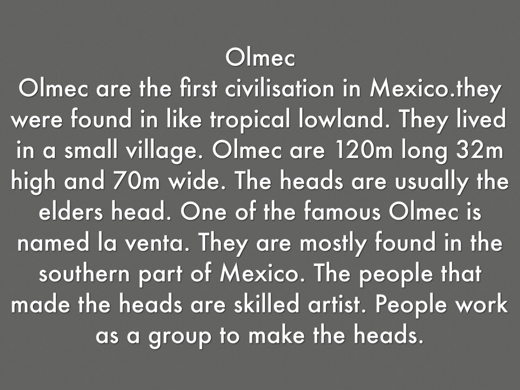 Olmec are the first civilisation in Mexico.they were found in like tropical lowland. They lived in a small village. Olmec are 120m long 32m high and 70m wide. The heads are usually the elders head. One of the famous Olmec is named la venta. They are mostly found in the southern part of Mexico. The people that made the heads are skilled artist. People work as a group to make the heads.