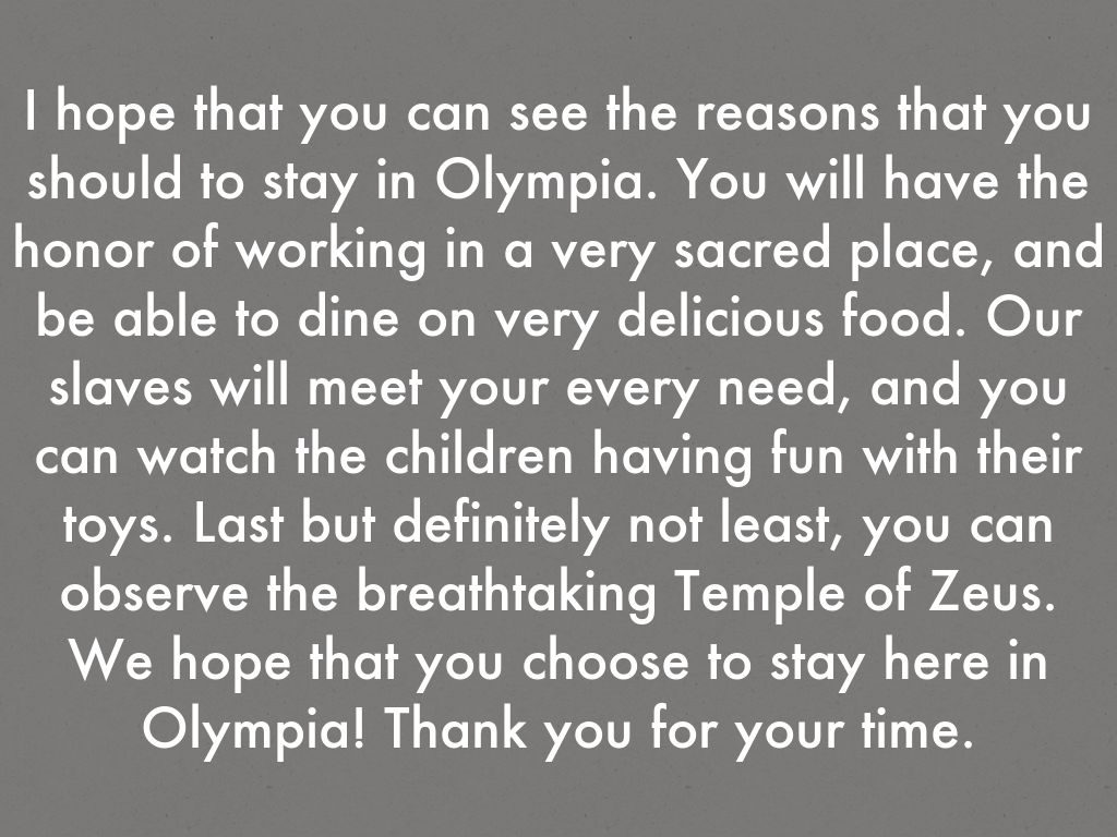 I hope that you can see the reasons that you should to stay in Olympia. You will have the honor of working in a very sacred place, and be able to dine on very delicious food. Our slaves will meet your every need, and you can watch the children having fun with their toys. Last but definitely not least, you can observe the breathtaking Temple of Zeus. We hope that you choose to stay here in Olympia! Thank you for your time.