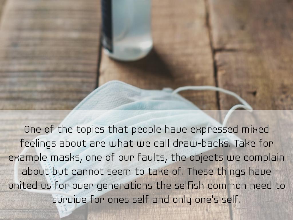 One of the topics that people have expressed mixed feelings about are what we call draw-backs. Take for example masks, one of our faults, the objects we complain about but cannot seem to take of. These things have united us for over generations the selfish common need to survive for ones self and only one's self.
