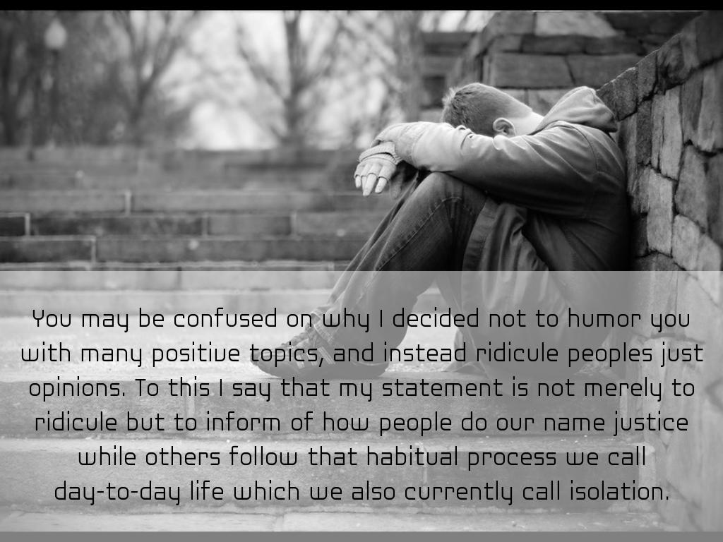 You may be confused on why I decided not to humor you with many positive topics, and instead ridicule peoples just opinions. To this I say that my statement is not merely to ridicule but to inform of how people do our name justice while others follow that habitual process we call day-to-day life which we also currently call isolation.
