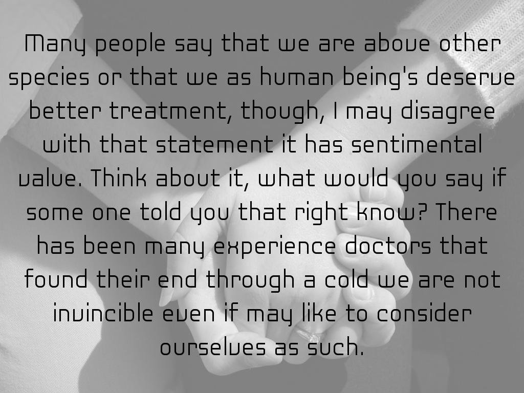 Many people say that we are above other species or that we as human being's deserve better treatment, though, I may disagree with that statement it has sentimental value. Think about it, what would you say if some one told you that right know? There has been many experience doctors that found their end through a cold we are not invincible even if may like to consider ourselves as such.