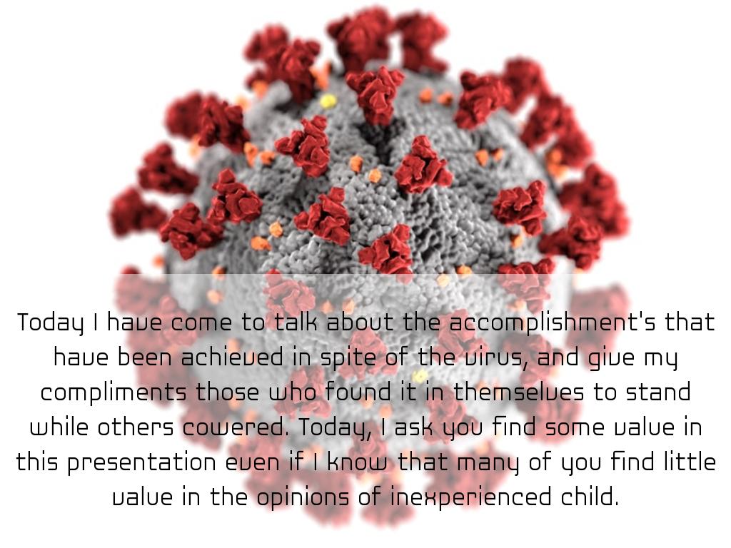 Today I have come to talk about the accomplishment's that have been achieved in spite of the virus, and give my compliments those who found it in themselves to stand while others cowered. Today, I ask you find some value in this presentation even if I know that many of you find little value in the opinions of inexperienced child.
