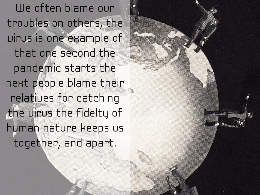 We often blame our troubles on others, the virus is one example of that one second the pandemic starts the next people blame their relatives for catching the virus the fidelty of human nature keeps us together, and apart.