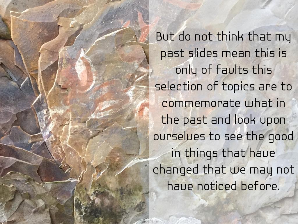 But do not think that my past slides mean this is only of faults this selection of topics are to commemorate what in the past and look upon ourselves to see the good in things that have changed that we may not have noticed before.