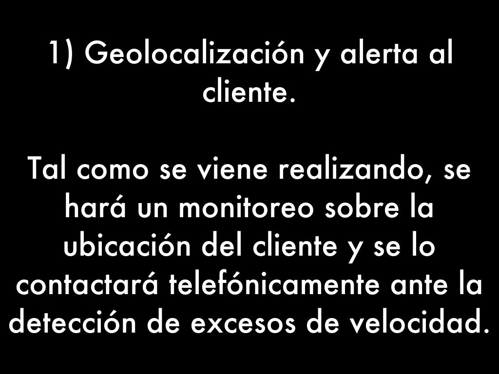 Tal como se viene realizando, se hará un monitoreo sobre la ubicación del cliente y se lo contactará telefónicamente ante la detección de excesos de velocidad.