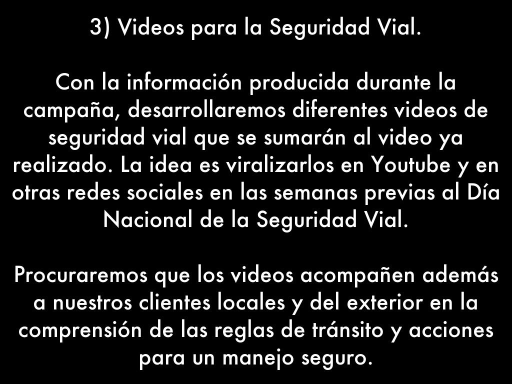 Con la información producida durante la campaña, desarrollaremos diferentes videos de seguridad vial que se sumarán al video ya realizado. La idea es viralizarlos en Youtube y en otras redes sociales en las semanas previas al Día Nacional de la Seguridad Vial.