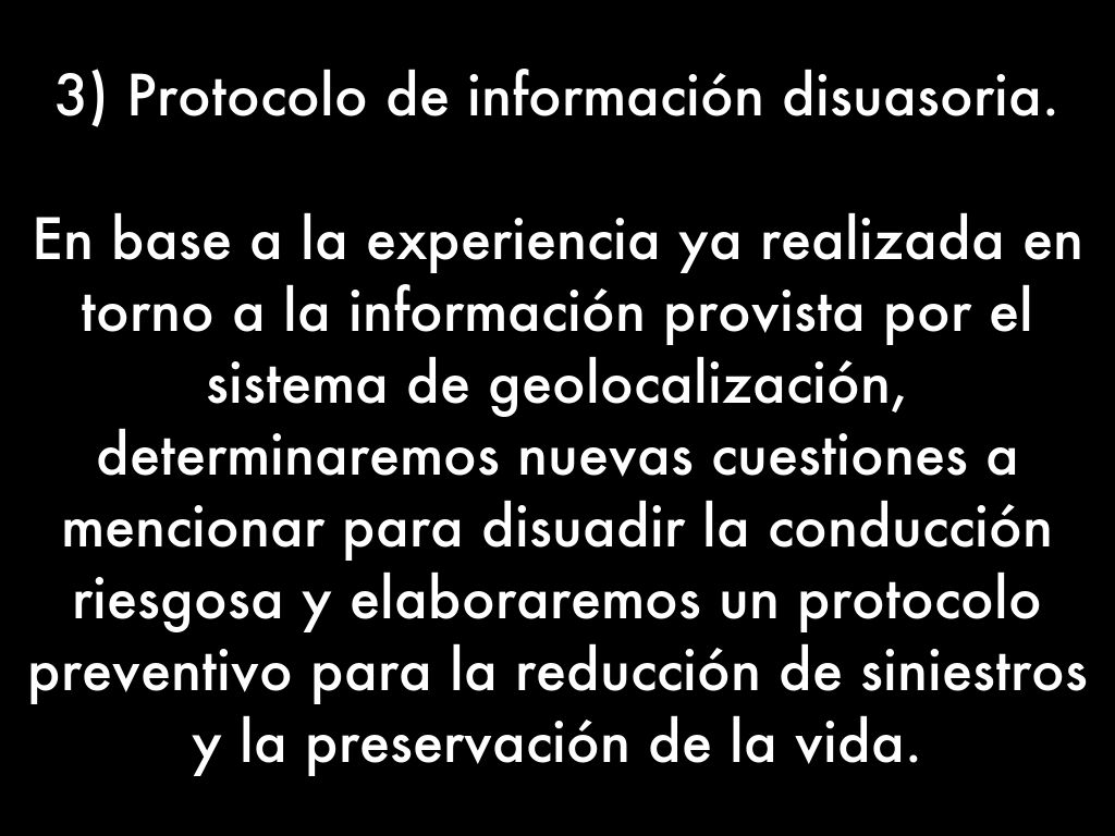 En base a la experiencia ya realizada en torno a la información provista por el sistema de geolocalización, determinaremos nuevas cuestiones a mencionar para disuadir la conducción riesgosa y elaboraremos un protocolo preventivo para la reducción de siniestros y la preservación de la vida.