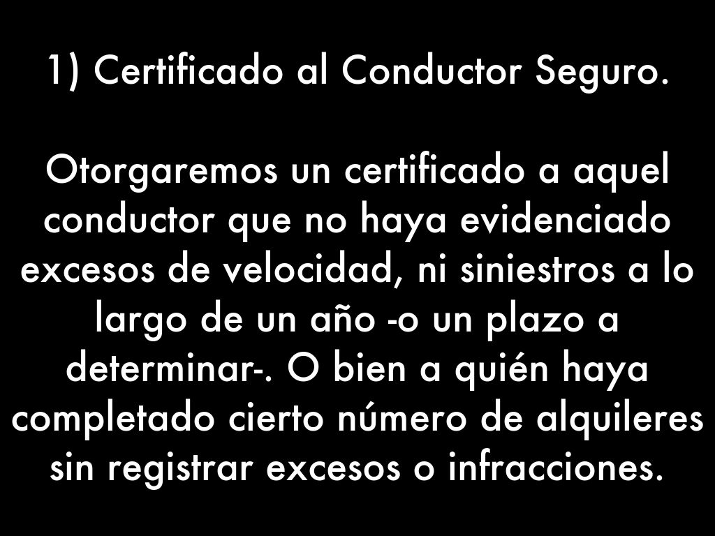 Otorgaremos un certificado a aquel conductor que no haya evidenciado excesos de velocidad, ni siniestros a lo largo de un año -o un plazo a determinar-. O bien a quién haya completado cierto número de alquileres sin registrar excesos o infracciones.