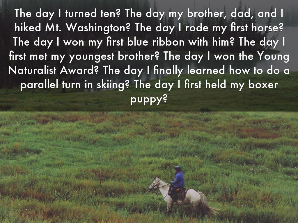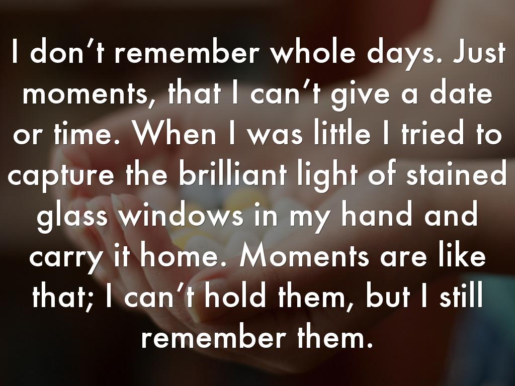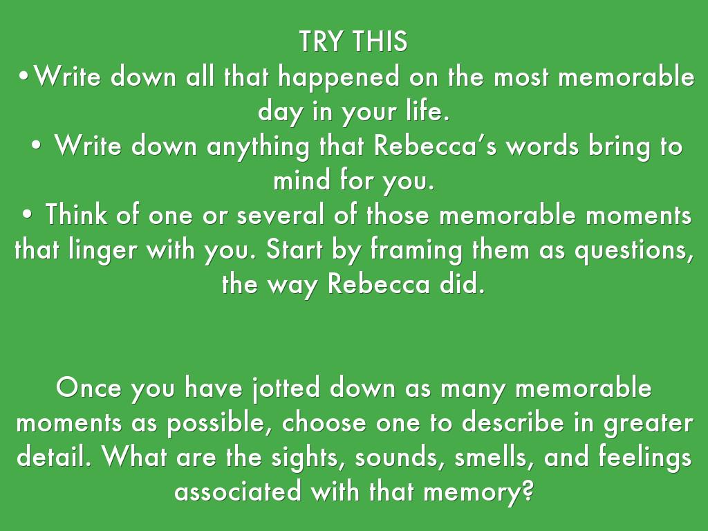 • Think of one or several of those memorable moments that linger with you. Start by framing them as questions, the way Rebecca did.